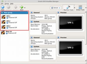 VirtualBox این امکان را به شما می دهد تا بتوانید گروههایی از ماشین های مجازی را بسازید، آنها را مدیریت کنید و بتوانید بر روی آنها به عنوان یک موجودیت واحد عملیاتی را انجام دهید. شما می توانید اقدامات مختلفی از جمله بزرگ کردن و یا کوچک کردن، تغییر نام ، Start، Stop، Reset و Pause را بر روی گروهی از ماشین های مجازی انجام دهید.